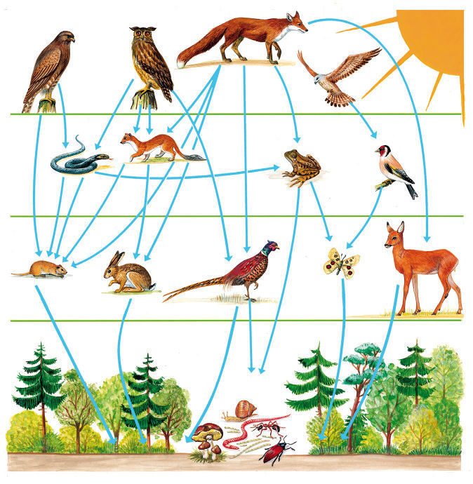 Innerhalb des Kreislaufes der Stoffe besteht ein Nahrungsnetz. Benutze für die Beschriftung: R, P, K1, K2, K3