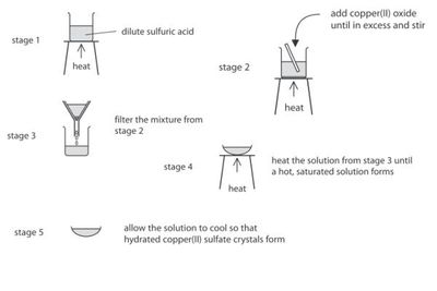 The diagram shows how hydrated copper(II) sulfate crystals can be made by reacting copper(II) oxide with dilute sulfuric acid.