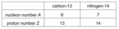 The table compares an atom of carbon-13 and an atom of nitrogen-14.