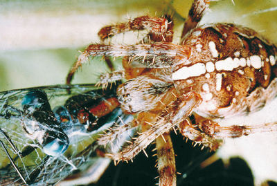 In Gärten und Wäldern findet man häufig Radnetze der Kreuzspinne. Die Spinne sitzt mit dem Kopf nach unten in der Mitte des Netzes. Sie wohnt dort, benützt aber gleichzeitig das Netz als Fangapparat.