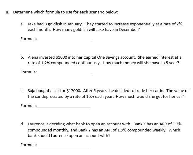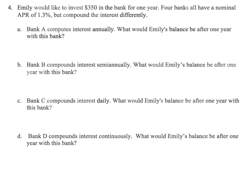Determine the amount of money in the each bank after one year. Be sure to round each answer accurately to TWO decimal places (it is money) and include the units ($ before the number).