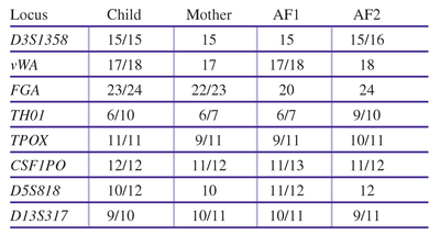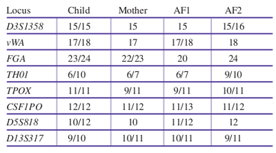 Alleged Father 1 has the following STR haplotype: TPOX = 6/10; D5S818 = 9/13; D13S317 = 9/14; vWA = 14/16; D21S11 = 30/33.