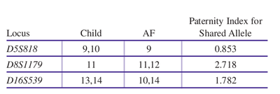 A child and an alleged father (AF) share alleles with the following paternity index: