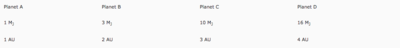 A hypothetical solar system has planets evenly spaced in circular orbits from the sun in the following distances and with the following masses, that they are given in terms with the mass of Jupiter MJ. Which of the following planets exerts the larger gravitational force of the star.
