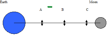 At which position (A, B, C) is the gravitational force of the Earth on the spaceship (green capsule) going to the Moon is the greatest?