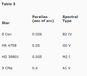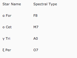 The table lists the spectral types for each of four stars. Which star in this table would have the highest surface temperature?