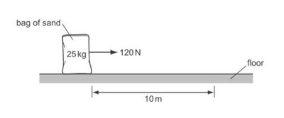 A horizontal force of 120 N is used to pull a 25 kg bag of sand 10 m along a floor.