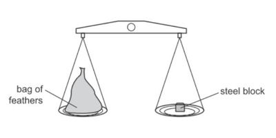 What does this show about the masses and the weights of the bag of feathers and the steel block?