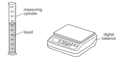 The student records the volume of the liquid from the scale on the measuring cylinder. He then puts the measuring cylinder containing the liquid on a balance and records the mass.