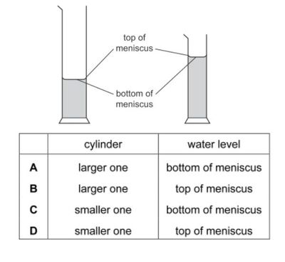 A student wishes to measure accurately the volume of approximately 40 cm^3 of water. She has two measuring cylinders, a larger one that can hold 100 cm^3, and a smaller one that can hold 50c m^3. The water forms a meniscus where it touches the glass.