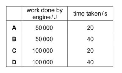 The table shows the work done by the engine in each car and the time taken by each car.