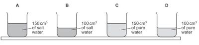 Two beakers contain salt water of density 1.1 g / cm^3 and two beakers contain pure water of