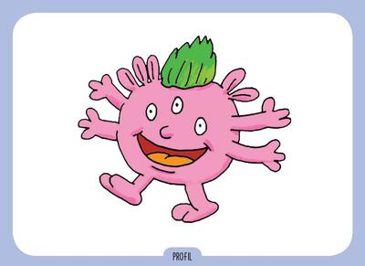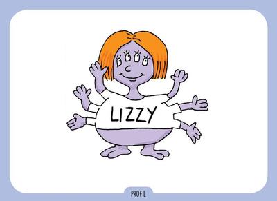 Lizzy is [blank_start]purple[blank_end]. She has got [blank_start]orange[blank_end] hair. She has got [blank_start]four[blank_end] eyes and one [blank_start]small[blank_end] nose. She has got six [blank_start]arms[blank_end] and two [blank_start]legs[blank_end].