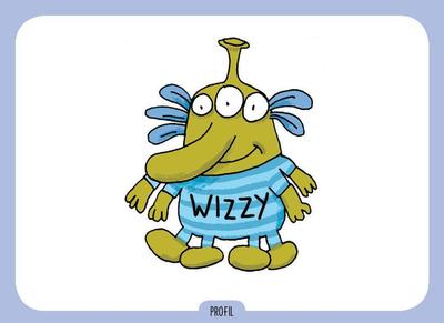 Wizzy is a [blank_start]green[blank_end] monster. He has got a [blank_start]long[blank_end] nose, three [blank_start]eyes[blank_end], five [blank_start]ears[blank_end], four [blank_start]arms[blank_end] and [blank_start]four[blank_end] legs.