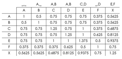 A relationship matrix has been calculated for a small population and is given below. Calculate the relationship coefficient between X and C.