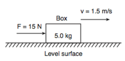 As shown in the diagram, an open box and its contents have a combined mass of 5.0 kilograms. A horizontal force of 15 newtons is required to push the box at a constant speed of 1.5 meters per second across a level surface. The inertia of the box and its contents increases if there is an increase in the