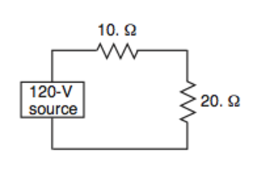 The diagram represents a circuit consisting of two resistors connected to a source of potential difference. What is the current through the 20.-ohm resistor?