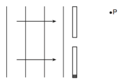 The diagram shows a series of wave fronts approaching an opening in a barrier. Point P is located on the opposite side of the barrier. The wave fronts reach point P as a result of