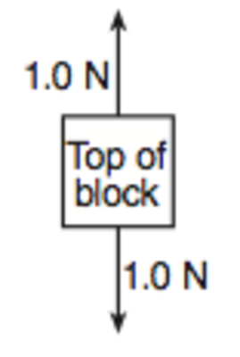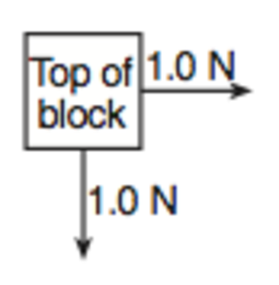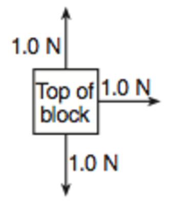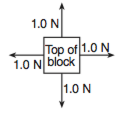 A number of 1.0-newton horizontal forces are exerted on a block on a frictionless, horizontal surface. Which top-view diagram shows the forces producing the greatest magnitude of acceleration of the block?