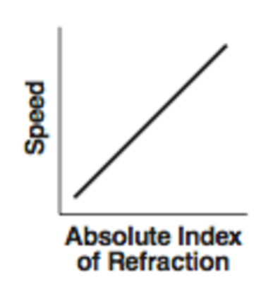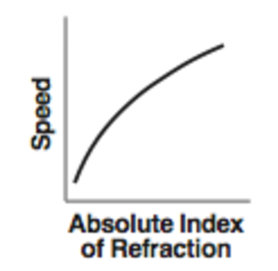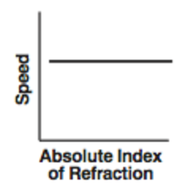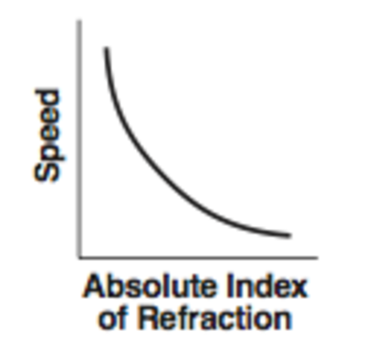 A ray of light ( f = 5.09 × 1014 Hz) travels through various substances. Which graph best represents the relationship between the absolute index of refraction of these substances and the corresponding speed of light in these substances?
