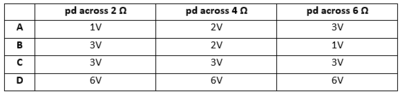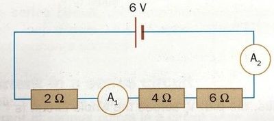 The figure below shows three resistors of values 2Ω, 4Ω and 6 Ω connected in series to a 6V dry cell.