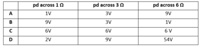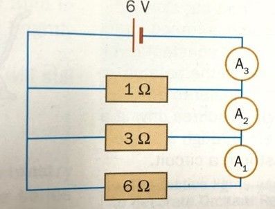 The figure below shows three resistors of values 1 Ω, 3 Ω and 6 Ω connected in parallel to a 6V dry cell.