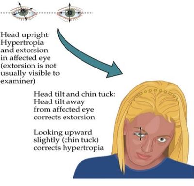 Patient has Vertical Diplopia so he is trying to minimize the effect while focusing on you.