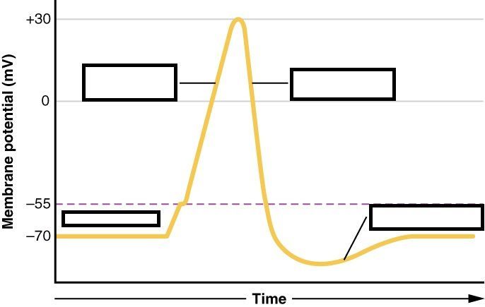 - [blank_start]Depolarization[blank_end]: membrane becomes more positive away from the RMP