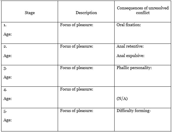 Fill in the blanks of the diagram of Freud's psychosexual stages, including the stage, age, description, and consequences of unresolved conflict