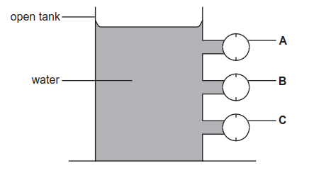 The diagram shows an open tank containing water. A, B and C are gauges which measure water pressure in the tank. Select the statement which is correct.