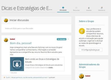 Os novos grupos de GoConqr terão agora 4 abas: Atividade (discussões, enquentes, postar recursos, dúvidas, imagens, links, videos etc.) Recursos (Biblioteca com os recursos compartilhados no grupos) Análise (apenas para grupos privados) Membros  Isso ajuda na sua navegação e facilitar o acesso àquilo que você quer.