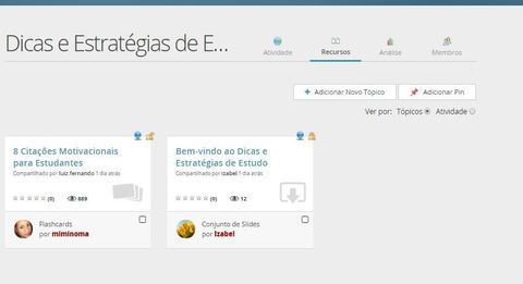 Você viu acima que pode postar um recurso de GoConqr na aba "Atividade", ao iniciar uma nova discussão. Mas você também pode compartilhar seus recursos (ou qualquer recurso de GoConqr) na aba "Recursos". 1. Clique na aba "Recursos" 2. Clique no botão "Adicionar Pin"  3. Selecione os recursos que deseja compartilhar4. Clique em "Adicionar Pin em um Grupo".5. E pronto! O recurso selecionado foi compartilhado com o Grupo!