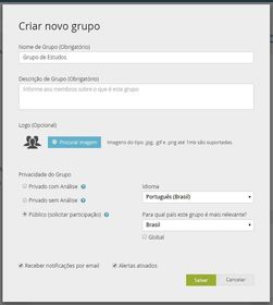 Para criar um novo grupo:1. Clique no ícone +Criar Grupos, no menu lateral esquerdo da sua página. 2. Insira o nome do grupo, a descrição e escolha uma imagem para o grupo.3. Escolha o tipo de grupo que deseja criar. As opções são: Privado com Análise, Privado sem Análise (nos Grupos privados, apenas os administradores podem convidar novos membros) e Público (qualquer usuário de GoConqr pode pedir para participar e o administrador aceita ou rejeita o pedido)4. Clique em Salvar