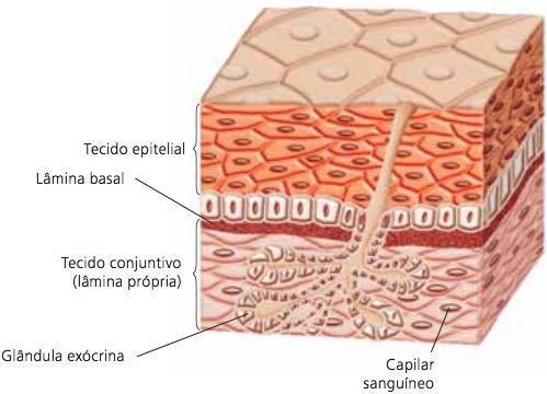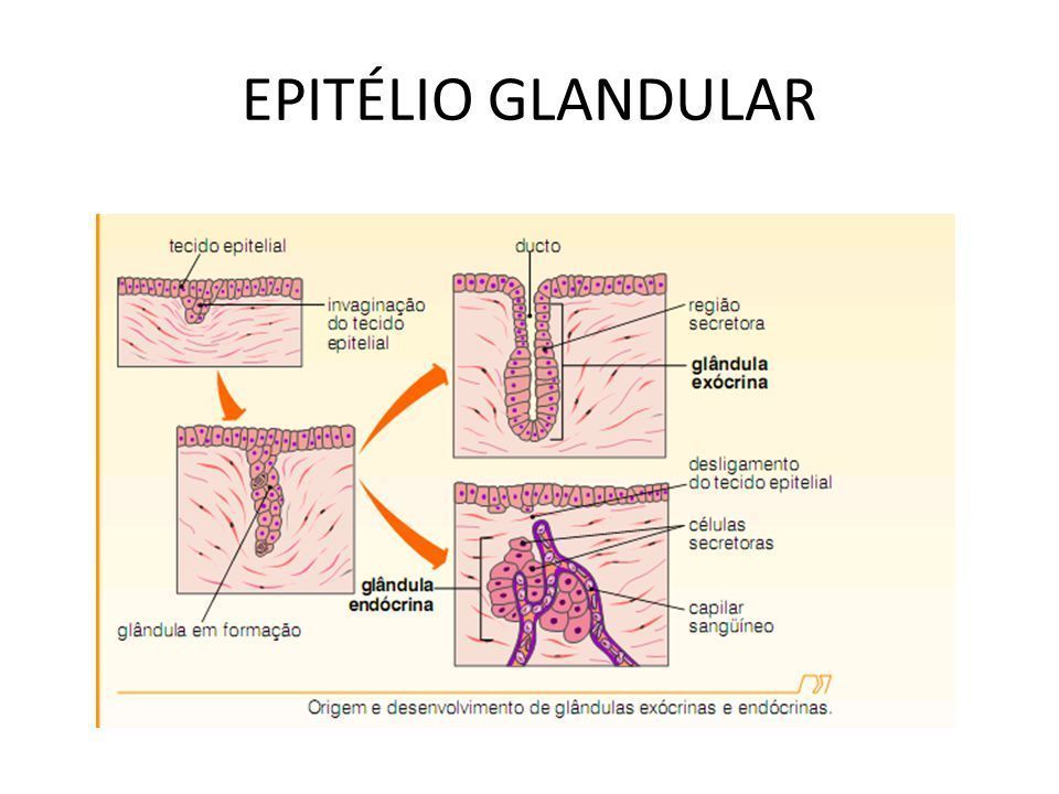 Tecido Epitelial secretor ou glandular: apresenta como funções secretar substâncias que agem em diversas regiões do organismo. Esse tecido é constituído por glândulas, estruturas formadas pela proliferação de células epiteliais que penetram do tecido conjuntivo subjacente e diferenciam-se posteriormente. Exitem três tipos de glândulas: