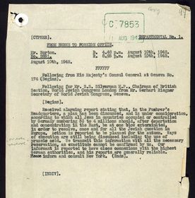 Telegram from Gerhart Riegner, Secretary of the World Jewish Congress in Geneva.The telegram was among the first pieces of unambiguous evidence received by the Allies that the Nazi Government planned a 'final solution' to the "Jewish question".
