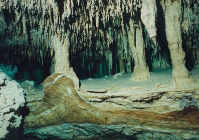 joints and bedding planes, it reacts with the rock to form calcium bicarbonate.