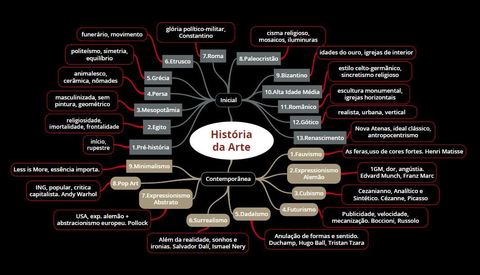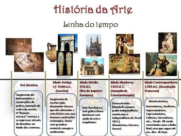 Arte da Pré-História Arte da antiguidade Arte da Idade Média Arte do Renascimento - Renascimento - BarrocoArte moderna - Impressionismo - Cubismo - Futurismo - Dadaísmo - SurrealismoArte contemporânea