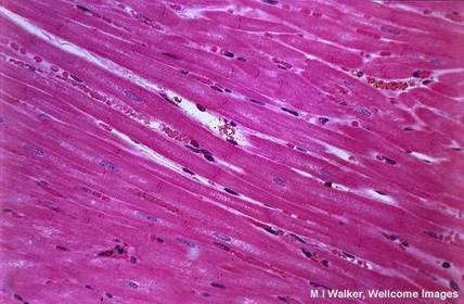 contains large numbers of mitochondria (to supply high energy demands) and myoglobin molecules (a protein that stores oxygen to keep up with the high demand for oxygen due to continual contraction).