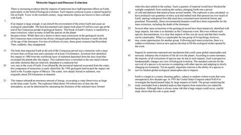 1. The word “pose” on line 2 is closest in meaning to a. claim b. model c. assume d. present------------------------------------- 2. In paragraph 2, why does the author include the information that dinosaurs had flourished for tens of millions of years and then suddenly disappeared? a. To support the claim that the mass extinction at the end of the Cretaceous is the best-documented of the dozen or so mass extinctions in the geological record b. To explain why as many as half of the species on Earth at the time are believed to have become extinct at the end of the Cretaceous c. To explain why paleontologists have always been intrigued by the mass extinction at the end of the Cretaceous d. To provide evidence that an impact can be large enough to disturb the environment of the entire planet and cause an ecological disaster