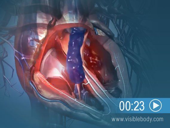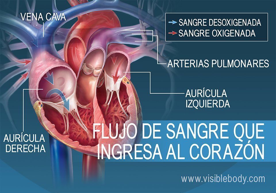 El corazón bombea sangre oxigenada desde el ventrículo izquierdo a la aorta para iniciar la circulación sistémica. Después de que la sangre ha suministrado oxígeno y nutrientes a las células de todo el cuerpo, retorna desoxigenada a la aurícula derecha del corazón. La sangre desoxigenada desciende de la aurícula derecha al ventrículo derecho. Luego el corazón la bombea desde el ventrículo derecho hacia las arterias pulmonares para iniciar la circulación pulmonar. La sangre se desplaza hacia los pulmones, intercambia dióxido de carbono por oxígeno y regresa a la aurícula izquierda. La sangre oxigenada desciende de la aurícula izquierda al ventrículo izquierdo que se encuentra más abajo, para comenzar nuevamente la circulación sistémica.