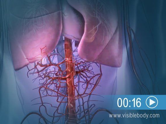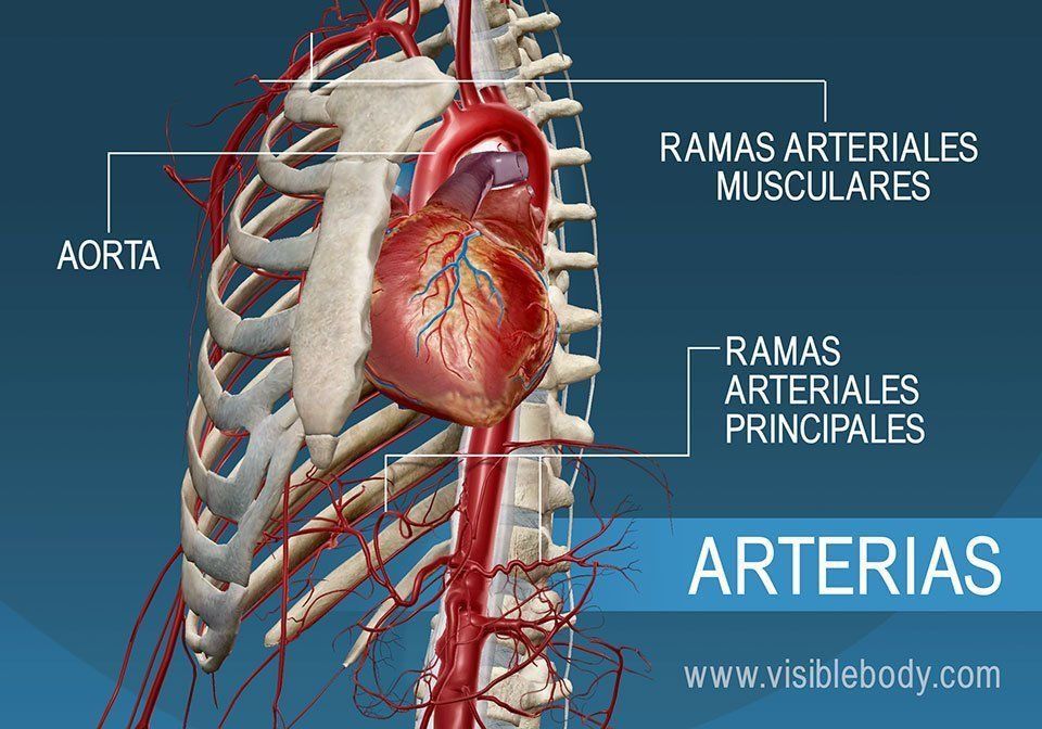 El ventrículo izquierdo del corazón bombea sangre oxigenada hacia la aorta. Desde allí, la sangre pasa a través de las arterias principales, que se ramifican en arterias musculares y luego en arteriolas microscópicas. Las arteriolas se ramifican en redes de capilares, aportan oxígeno y nutrientes a los tejidos. Las paredes de las arterias son más gruesas que las paredes de las venas, y tienen más tejido elástico y muscular liso. Esta estructura les permite a las arterias dilatarse a medida que la sangre es bombeada a través de ellas.