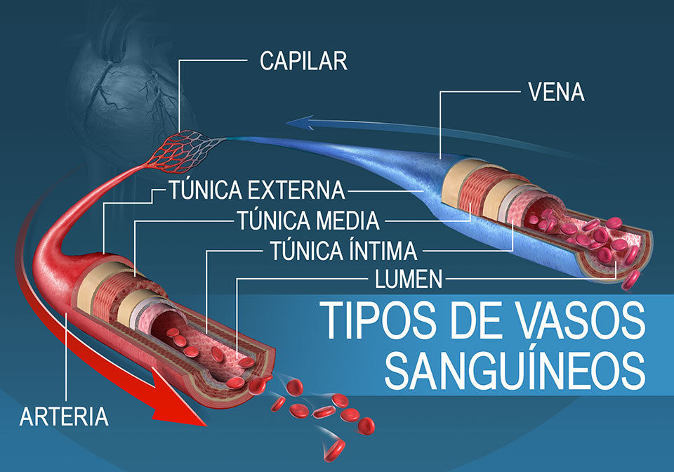 Los vasos sanguíneos transportan sangre por todo el cuerpo. Las arterias transportan sangre desde el corazón. Las venas llevan la sangre de regreso al corazón. Los capilares rodean a las células y a los tejidos del cuerpo para aportar y absorber oxígeno, nutrientes y otras sustancias. Los capilares también conectan las ramas de las arterias y las ramas de las venas. Las paredes de la mayoría de los vasos sanguíneos tienen tres capas diferentes: la túnica externa, la túnica media y la túnica íntima. Estas capas rodean la luz, el interior hueco por el que fluye la sangre.