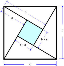 triangles. Here it is for our example squares:In each case, the area of the larger blue square is equal to the sum of the areas of the blue triangles and the area of the yellow square. Since the area of a square is (sidelength)2 and the area of a triangle is 1/2(base)(height), we can write the equation: (a+b)2 = c2 + 4[(1/2)ab] Simplifying:(a+b)2 = c2 + 4[(1/2)ab](a+b)(a+b) = c2 + 2aba2 + 2ab + b2 = c2 + 2ab Now subtract the 2ab from both sides of the equation, and we have the Pythagorean theorem: a2 + b2 = c2