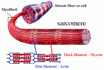 structure of skeletal muscle: composed of bundles of fibers, myofibril made of smaller myofibrilsmyosin: thick filamentsactin: thin filaments