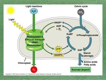 These molecules then undergo the second stage of photosynthesis, the biochemical reaction (i.e. the Calvin Cycle). Here they react with hydrogen formed from the splitting of water in the photochemical stage and carbon dioxide from the atmosphere with the presence of enzymes to form the organic glucose molecules. The reactions in this stage are referred to as light-independent reactions because they do not require light as they use the energy already provided by the light in the light-dependent reactions. Thus, photosynthesis has transferred the energy from light to chemical energy in the sugar.