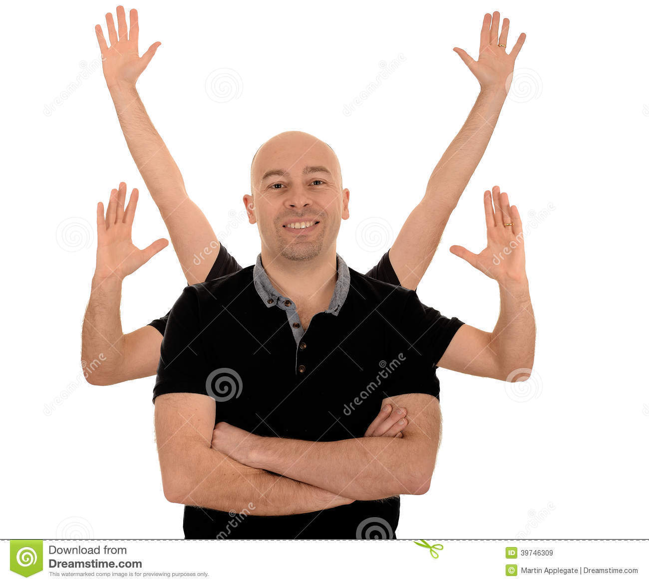 Smiling Man Six Arms Half Body Portrait White Studio Background 39746309 (image/jpeg)