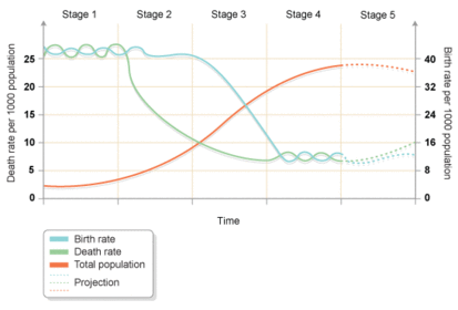 The birth rate is rapidly falling due to the emancipation of women and better education. The use of contraception increases and more women work instead of having children. The economy also changes to mainly manufacturing jobs, so less children work on farms. The death rate falls due to medical advances. The growth rate is high, and more people are living to older ages.