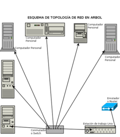 Puede ser vista como una colección de redes en estrella ordenadas en una jerarquía. Éste árbol tiene nodos periféricos individuales (por ejemplo, hojas) que requieren ‘transmitir a’ y ‘recibir de’ otro nodo solamente y no necesitan actuar como repetidores o regeneradores. Al contrario que en las redes en estrella, la función del nodo central se puede distribuir.