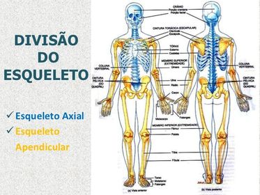 O sistema esquelético tem duas subdivisões básicas e importantes. São as subdivisões:1. Esqueleto Axial, onde nós tempos:* Coluna vertebral (região cervical, torácica, lombar, sacral e coccígea).* Caixa toráxica (esterno, costelas)*Crânio2. Esqueleto Apendicular* MMSS (membros superiores)* MMII (membros inferiores)