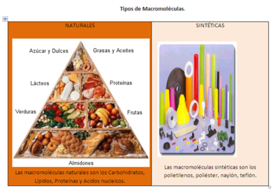 Todos los seres vivos estamos constituidos de agua y moléculas orgánicas complejas llamadas MACROMÓLECULAS, y se les conoce así porque son moléculas cuya masa molecular es superior a los 10 000 uma (unidad de masa atómica).Por otro lado, las macromoléculas se clasifican en NATURALES Y SINTÉTICAS. las primeras son encontradas en los seres vivo, mientras que las segundas son todas aquellas moléculas sintetizadas por el hombre para su bienestar.La importancia de las macromoléculas en el cuerpo humano es vital debido a que gracias a ellas el organismo realiza una gran cantidad de funciones para su desarrollo y supervivencia.Ahora bien las macromoléculas naturales se clasifican en Carbohidratos, Proteínas y Lípidos, compuestos cuyas moléculas poseen una elevada masa molecular, y en el caso de los carbohidratos y proteínas están constituidas por la recepción de algún tipo de sub unidad estructural,pudiéndose ser lineales o ramificadas.